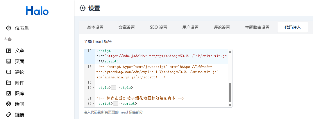 <canvas class="fireworks" style="position:fixed;left:0;top:0;z-index:99999999;pointer-events:none;"></canvas>我的网站使用的是Halo建站工具,直接在设置-代码注入中,将代码插入全局head标签。(个人站点:故河TTL)